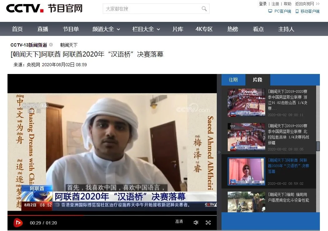 The Chinese CCTV network featured clips from this year’s Chinese bridge competition.